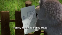 Волки вместе с Машей и бочкой мёда прибыли к дому Медведя, который принимает сделку. А волки, намучившиеся с Машей, убегают прочь.