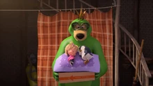 Время спать, но Маша с Пингвинёнком играли в моряков на корабле. В их воображении шторм прекратился и из воды выплыла огромная «царевна-лягушка». Маша попросила наколдовать ещё шторм, и воображаемые волны Медведя укачали их до сна.