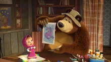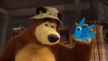 Придя наконец на реку, Медведь обнаруживает, что контейнер пуст и возвращается домой, где из снастей Маша сделала поделку. Маша завлекла Мишку на творческое соревнование по рисункам, шитью и созданию поделок, в котором тот изображал рыбок, а в конце создал огромную скульптуру рыбачащего себя. Мишка загрустил, и Маша, поняв его, создала красочные приманки и тот ушёл на рыбалку.